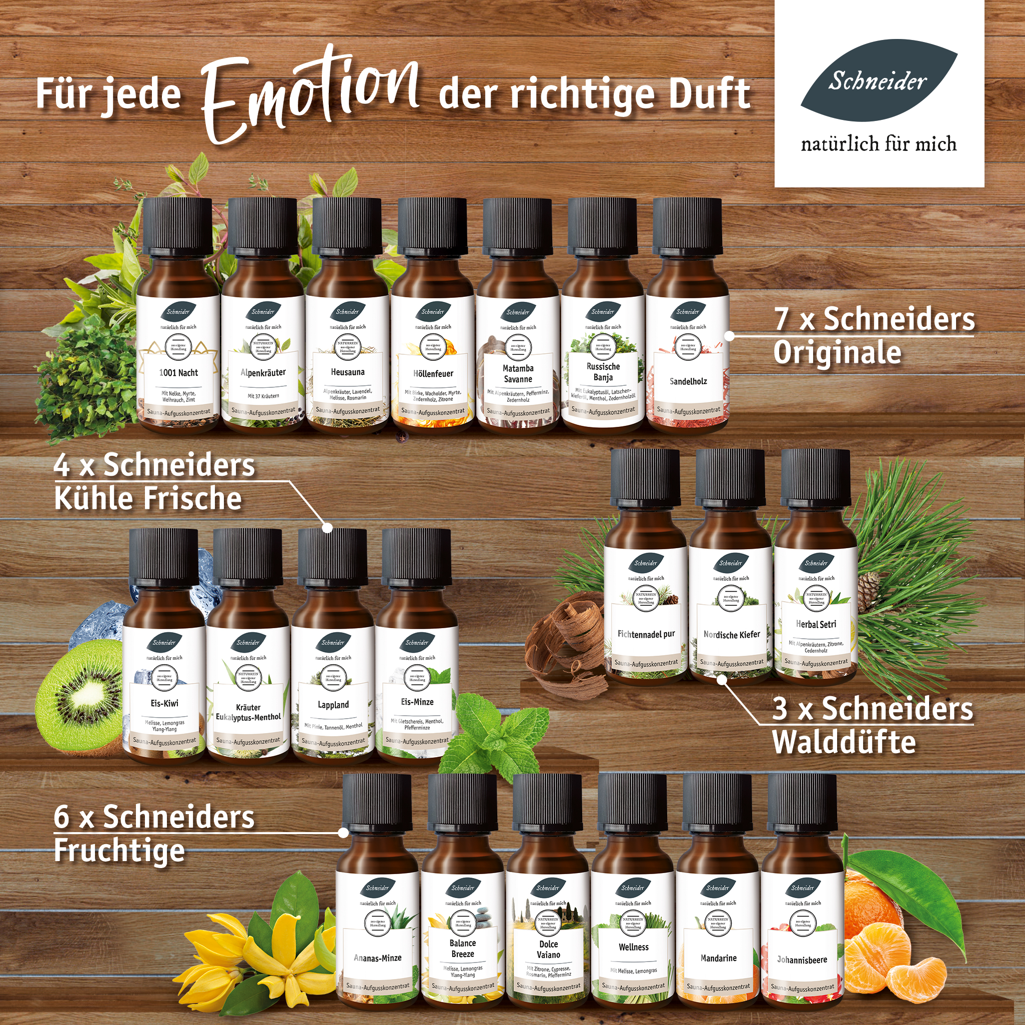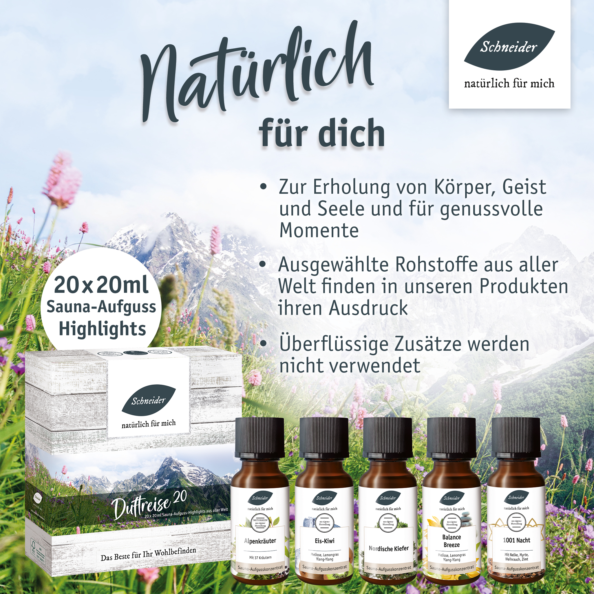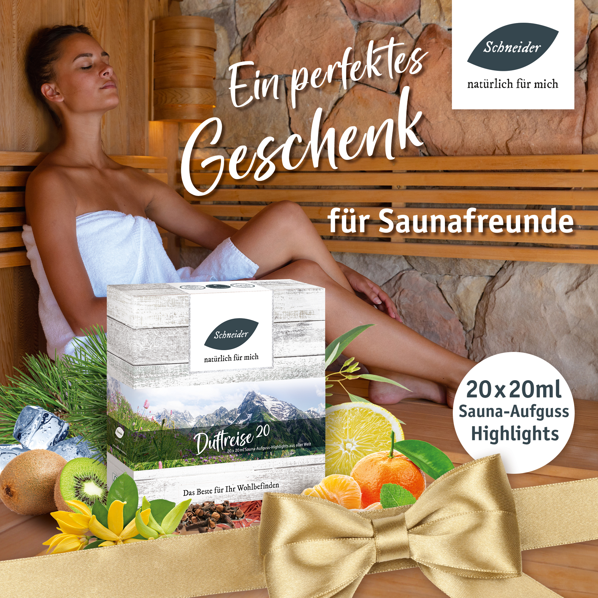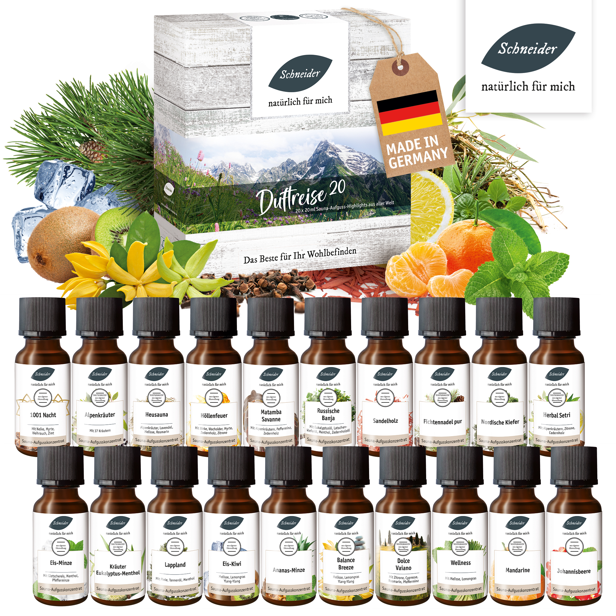 Entdecken Sie die Welt der Düfte – mit der Duftreise 20! Tauchen Sie ein in eine außergewöhnliche Vielfalt an Sauna-Aufguss-Highlights aus aller Welt. Mit 20 ausgewählten Premium-Düften à 20 ml bietet dieses Set die perfekte Möglichkeit, neue Lieblingsaromen zu entdecken - von orientalisch warm über waldig-frisch bis fruchtig-belebend. Erleben Sie pure Entspannung mit Klassikern wie Alpenkräuter, Russische Banja oder Nordische Kiefer, lassen Sie sich von exotischen Kompositionen wie 1001 Nacht und Matamba Afrika verzaubern oder genießen Sie fruchtige Frischemomente mit Mandarine, Ananas Minze und vielen weiteren Highlights. Die Duftreise 20 - ideal zum Verschenken, Probieren und Genießen. Gönnen Sie sich eine Auszeit und entdecken Sie, wie vielfältig Sauna sein kann!
