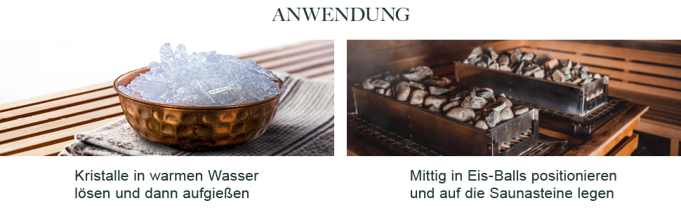 warmem Wasser gelöst oder in Eis-Balls eingearbeitet und auf die Saunasteine