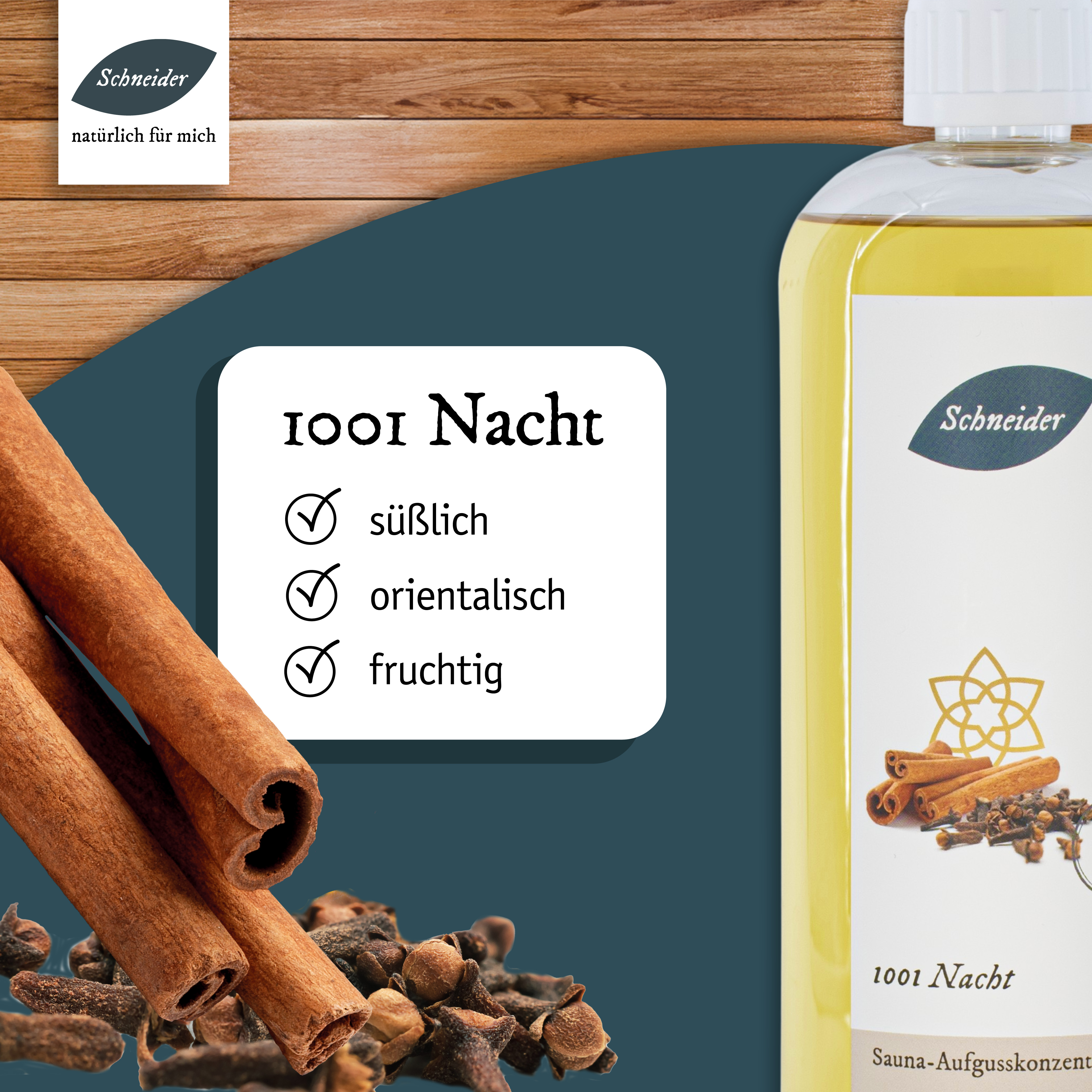 Fühlen Sie sich wie im Orient und tauchen Sie ein in die Welt von 1001 Nacht! Ein ganzes Potpourri an Düften erwartet Sie beim Saunaaufguss 1001 Nacht aus eigener Herstellung. Lassen Sie sich verwöhnen von der entspannenden Wirkung der ätherischen Öle und dem Zusammenspiel von süßlich-fruchtigen Noten mit erdig-holzigen Tönen.