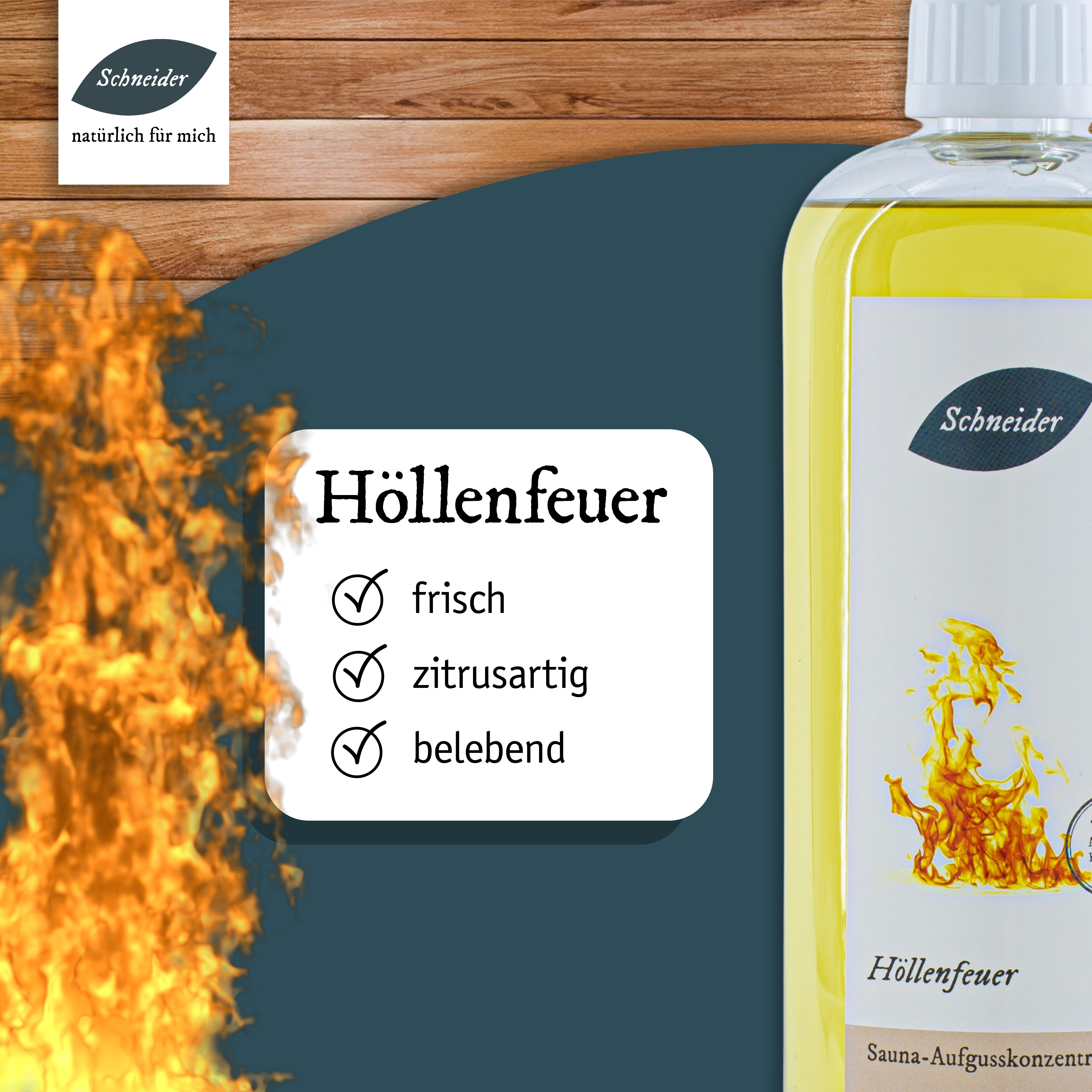 Beim Saunaaufguss Höllenfeuer aus eigener Herstellung ist der Name Programm! Das einzigartige Zusammenspiel aus sieben verschiedenen Ölen macht ihn zu einem absoluten Highlight im Bereich der Saunaaufgüsse. Wer richtig schwitzen will, wer das Feuer sucht, liegt hier absolut richtig! Anwendung: Die Dosierung der Aufgüsse kann abhängig sein von der Größe der Sauna, der Leistung der Heizelemente, den Vorlieben der Anwender und der Intensität der einzelnen Inhaltsstoffe (wie ätherischen Ölen, Ölgemischen oder Duftölen). Als Richtwert empfehlen wir ein bis zwei Esslöffel voll Aufgusskonzentrat oder 20 bis 25 ml Aufgusskonzentrat pro Liter Aufgusswasser. Je nach Belieben können Sie die Dosierung anpassen. Saunaaufgusskonzentrate sind sparsam zu verwenden und sollten nie pur auf die Aufgusssteine oder Heizelemente gegeben werden.