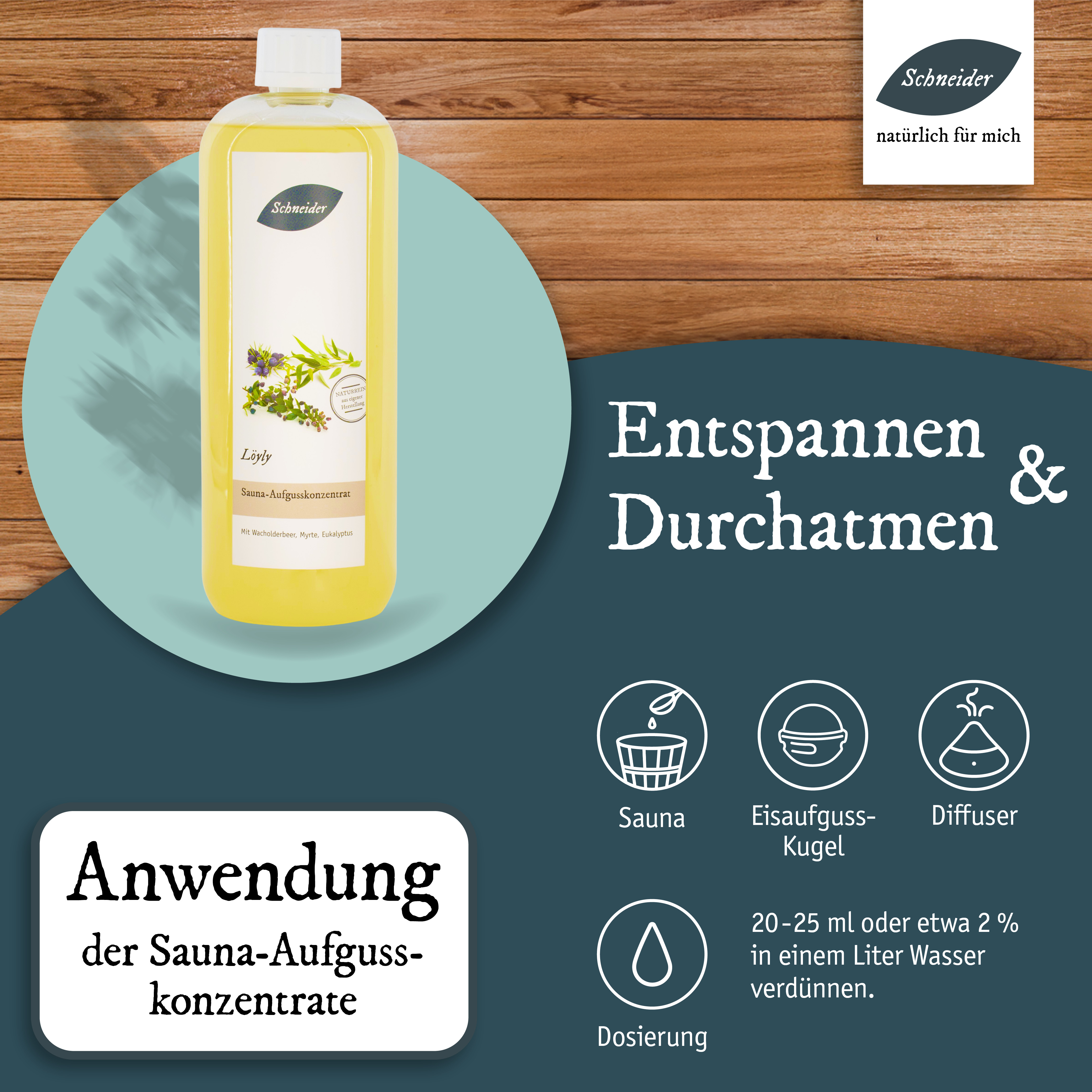 Tauchen Sie ein in das einzigartige Dufterlebnis von Löyly Saunaaufguss aus eigener Herstellung. Die einmalige Kombination aus verschiedenen aromatischen Ölen – mit intensiven und komplexen Duftnoten, harmonisch abgestimmt – wird Sie begeistern! Der Begriff „Löyly“ stammt aus dem Finnischen und bedeutet frei übersetzt „Gluthauch“. Lassen Sie sich überraschen! Anwendung: Die Dosierung der Aufgüsse kann abhängig sein von der Größe der Sauna, der Leistung der Heizelemente, den Vorlieben der Anwender und der Intensität der einzelnen Inhaltsstoffe (wie ätherischen Ölen, Ölgemischen oder Duftölen). Als Richtwert empfehlen wir ein bis zwei Esslöffel voll Aufgusskonzentrat oder 20 bis 25 ml Aufgusskonzentrat pro Liter Aufgusswasser. Je nach Belieben können Sie die Dosierung anpassen. Saunaaufgusskonzentrate sind sparsam zu verwenden und sollten nie pur auf die Aufgusssteine oder Heizelemente gegeben werden.