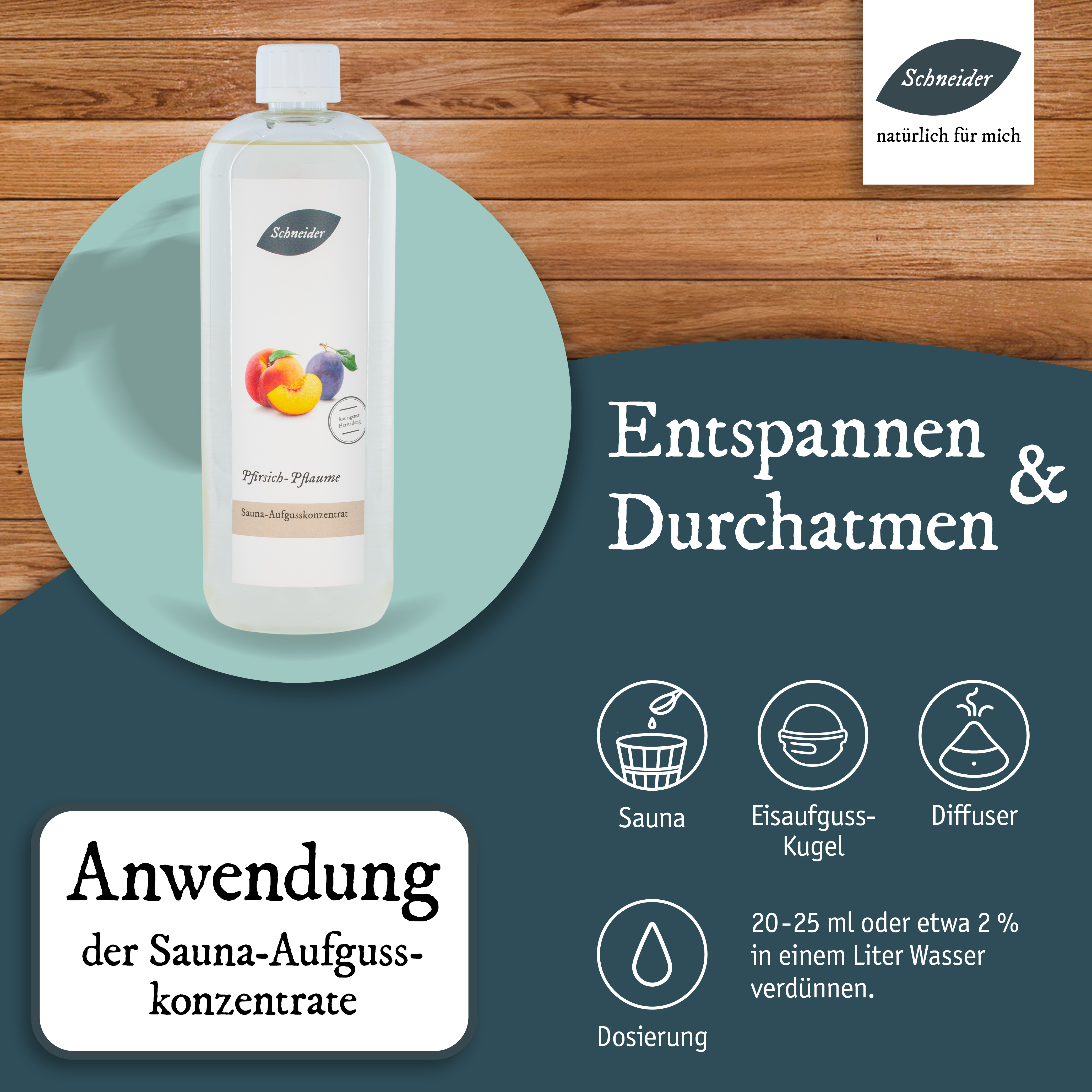 Erleben Sie die verführerische Duftkombination aus Pfirsich und Pflaume: Noten vom saftigen Fruchtfleisch der Pfirsiche, kombiniert mit den fruchtig-süßen Aromen von sonnengereiften Pflaumen, umspielen Sie. Der Saunaaufguss Pfirsich-Pflaume aus eigener Herstellung ist besonders bei „Süßnasen“ und Liebhabern von Likören und Obstbränden beliebt. Anwendung: Die Dosierung der Aufgüsse kann abhängig sein von der Größe der Sauna, der Leistung der Heizelemente, den Vorlieben der Anwender und der Intensität der einzelnen Inhaltsstoffe (wie ätherischen Ölen, Ölgemischen oder Duftölen). Als Richtwert empfehlen wir ein bis zwei Esslöffel voll Aufgusskonzentrat oder 20 bis 25 ml Aufgusskonzentrat pro Liter Aufgusswasser. Je nach Belieben können Sie die Dosierung anpassen. Saunaaufgusskonzentrate sind sparsam zu verwenden und sollten nie pur auf die Aufgusssteine oder Heizelemente gegeben werden.