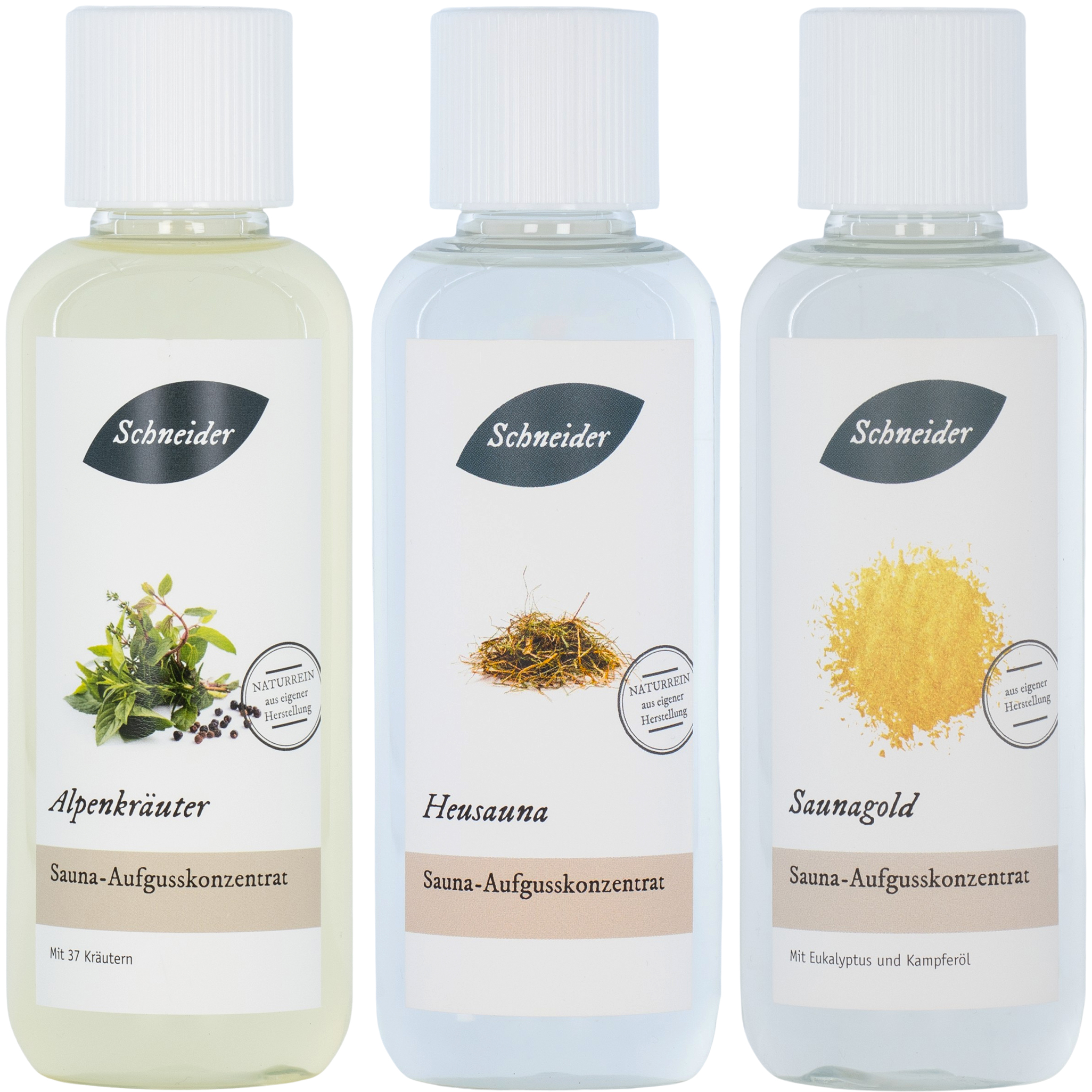 250 ml Alpenkräuter, 250 ml Heusauna, 250 ml Saunagold