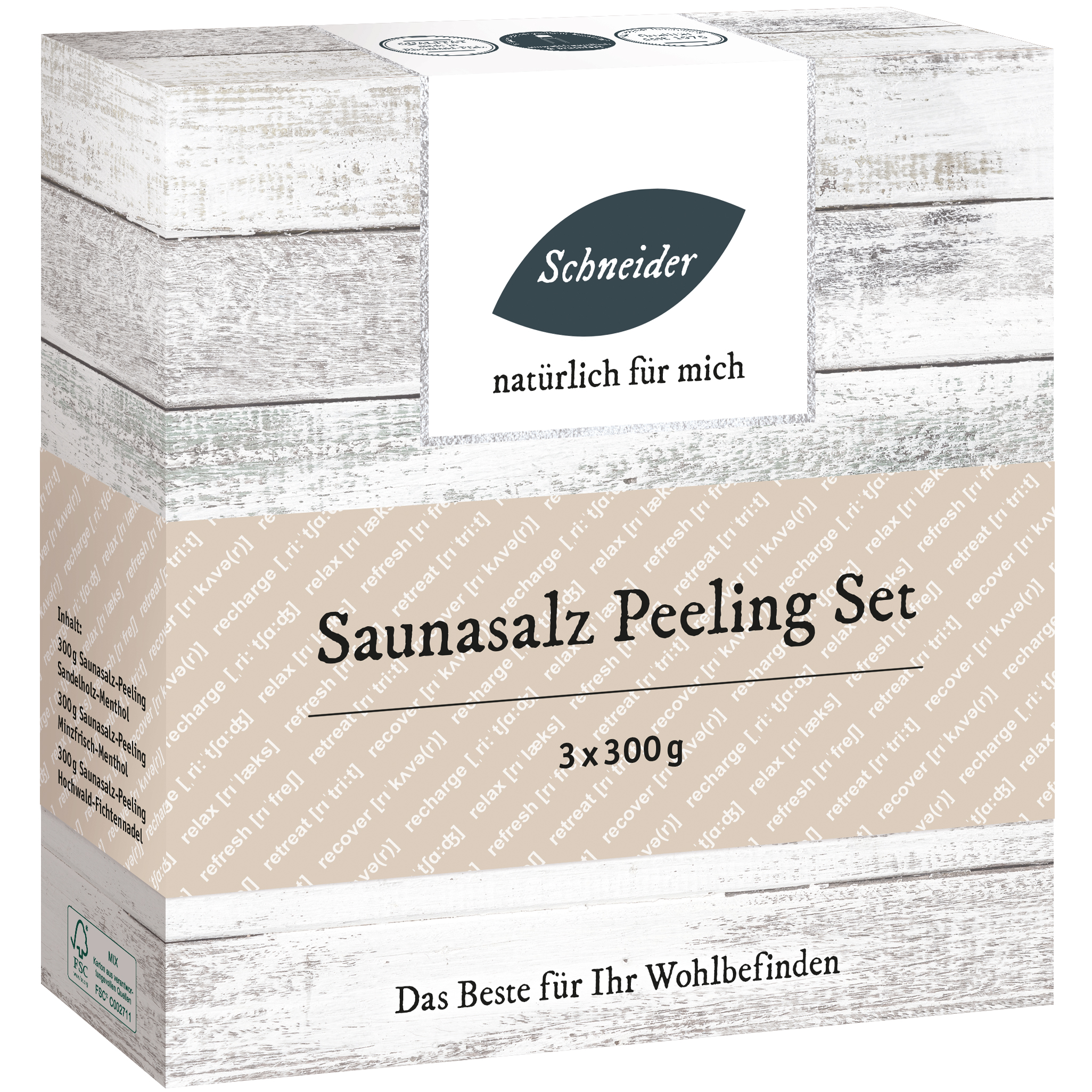 300 g Saunasalz-Peeling Sandelholz-Menthol, 300 g Saunasalz-Peeling Minzfrisch-Menthol, 300 g Saunasalz-Peeling Hochwald-Fichtennadel